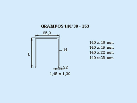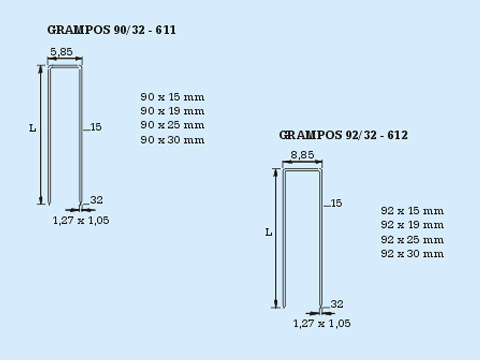 Este tipo de grampo é ideal para aplicação em emendas de madeira em moveis, caixas e embalagens de madeira. Nas opções WM 12 - com pernas de comprimento de 6, 9 e 12mm - e WM 15 com pernas de comprimento de 9, 12 e 15 mm.